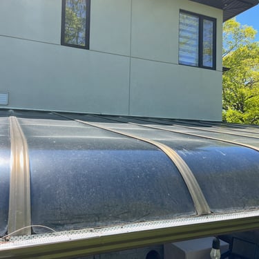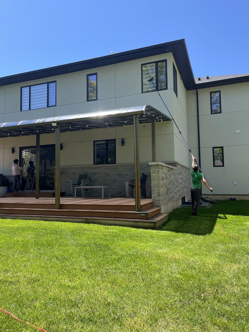 Spruced up a residence with both; the state of the art Water Fed Pole System as pictured on the right, as well as a team member implementing traditional squeegee and mop methods on the more delicate areas. The team made sure to handle the long neglected awning.