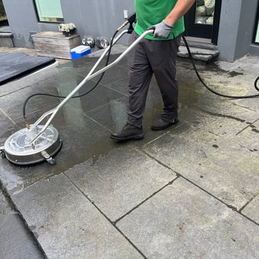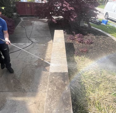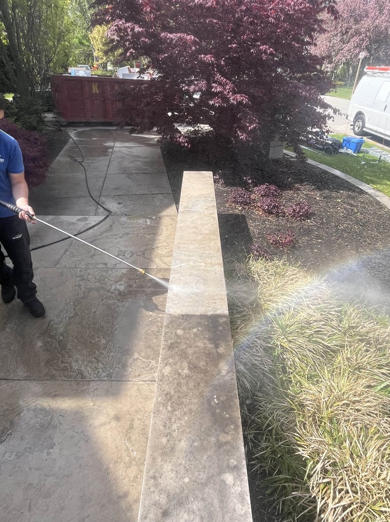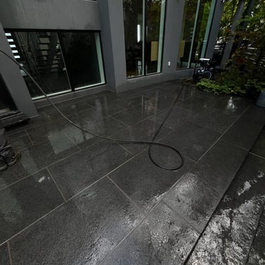 Deep cleaned a heavily stained driveway and all walkways, removing dirt, algae, and years of buildup. Restored the original color and improved curb appeal - We gave the rooftop patio the same treatment as well.